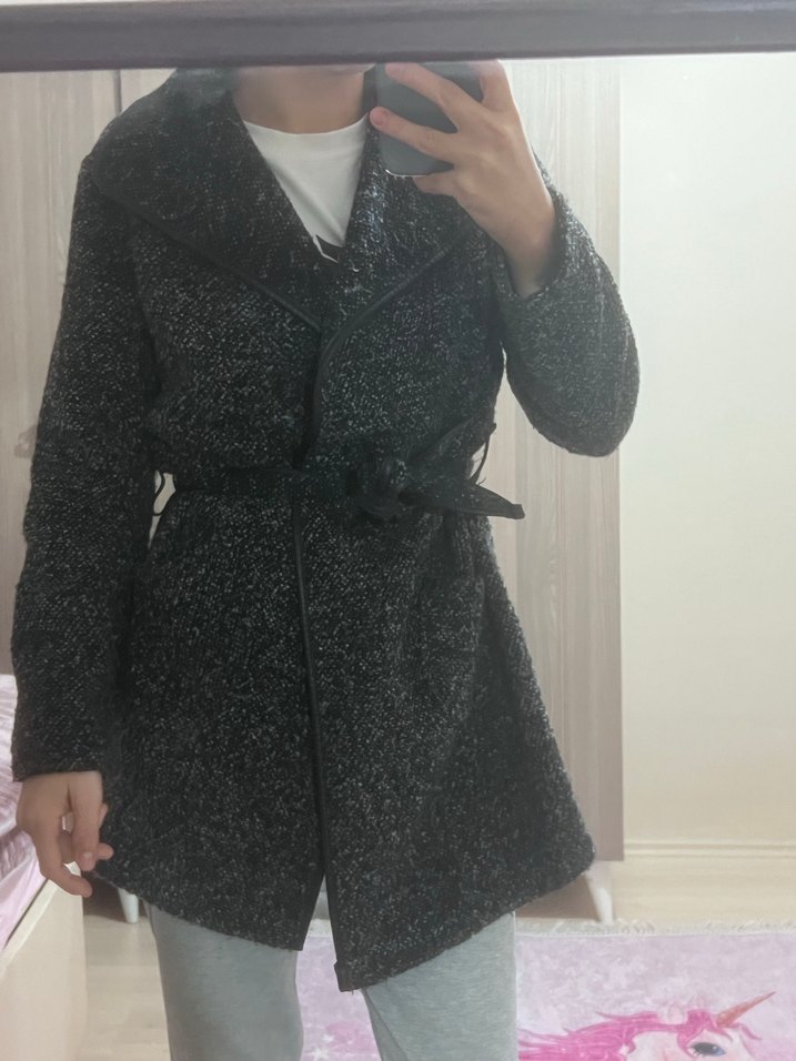 Gri yün kumaştan, kemerli ve kesimli yakalı, uzun kollu midi boy kadın kaban. Trendy ve rahat sokak stiline uygun.