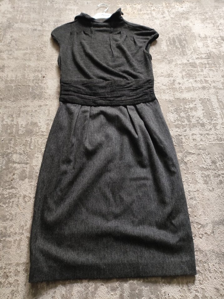 Kolsuz, yüksek yakalı, gri kemerli örme elbise. Vücuda oturan kesim ve midi boy, ofis için uygun.