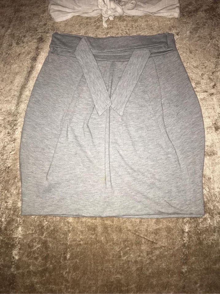 Gri renkli, kemerli ve bol kesimli midi mini etek. Yumuşak sentetik kumaştan rahat ve gündelik kullanıma uygun.