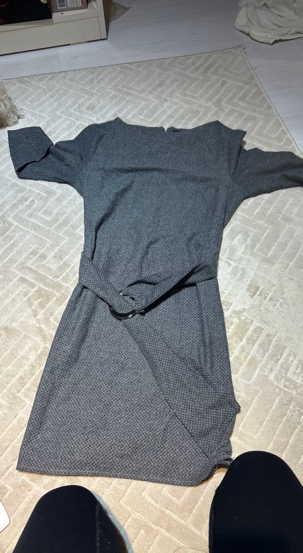 Gri renkli, kemerli, ve midi uzunlukta, vücuda oturan triko elbise. Günlük ve iş ortamına uygun sade tasarım sunar.