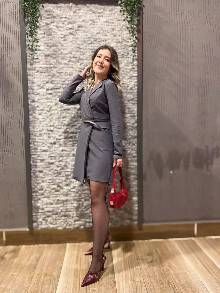 Gri kısa elbise önden ceket görünümlü çok şık 36 beden sadece bir kere giyildi boyum 172