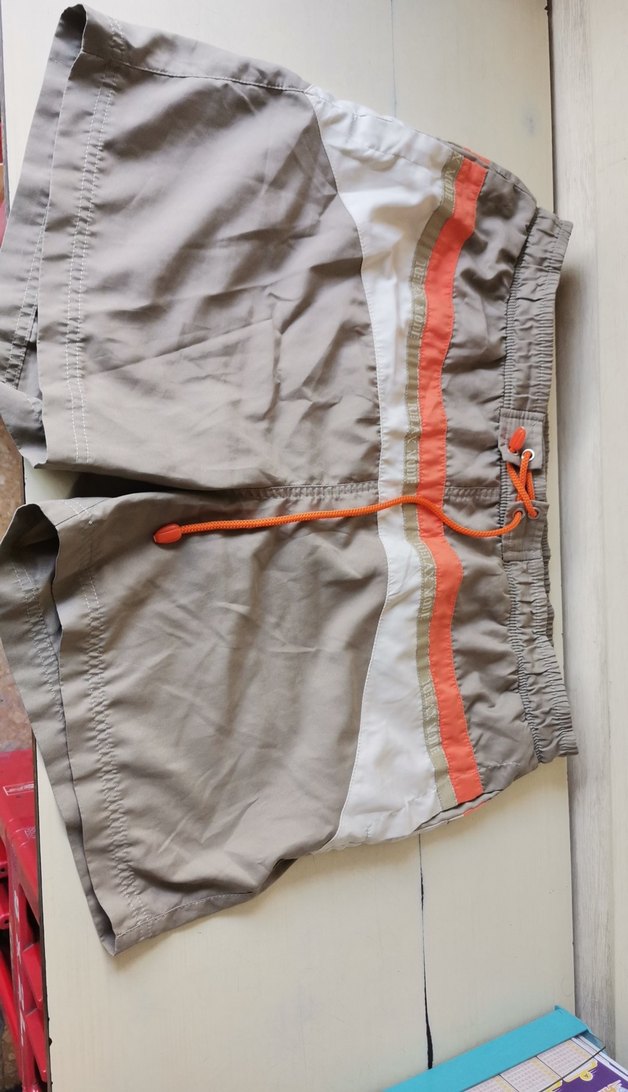 Gri renkli, kemerli ve bol kesim erkek mini şort. Turuncu ve beyaz şeritlerle dış mekan ve sokak stili için uygun.