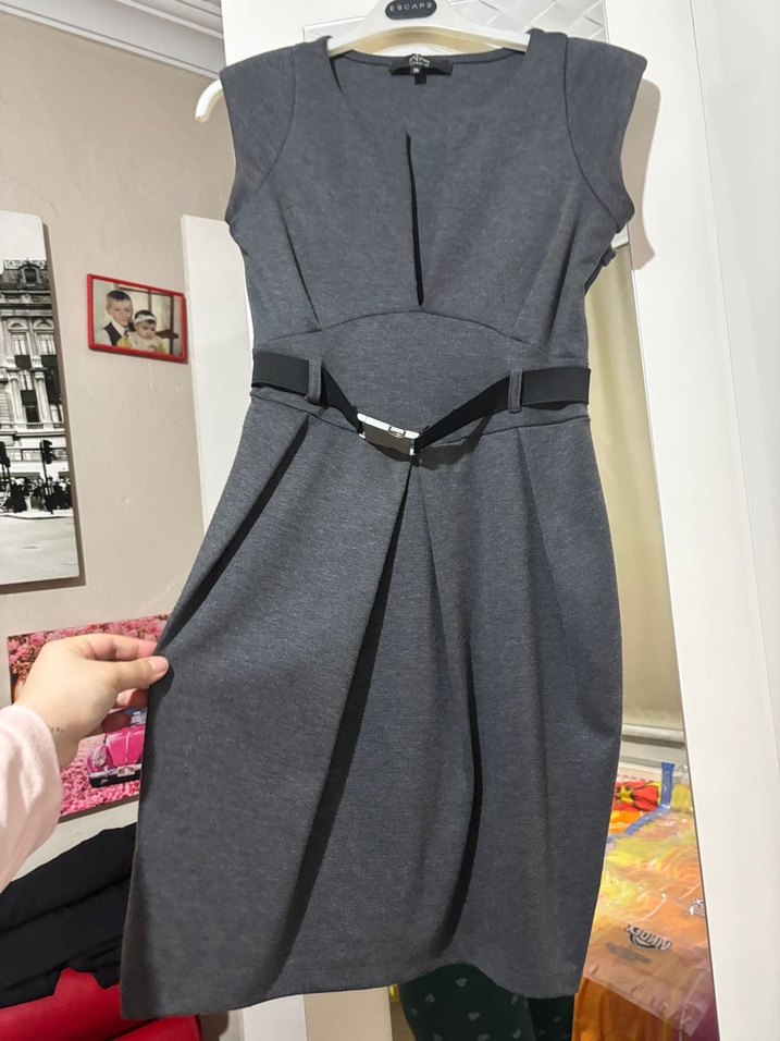 Kemer detaylı, v yaka ve kolsuz gri elbise.Vücuda oturan kesime sahip, sentetik kumaştan.