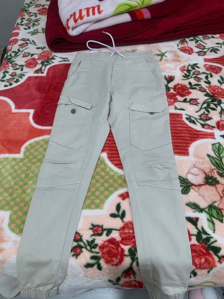Gri renkte pamuklu, kemerli ve cepli rahat kesim erkek pantolonu, günlük kullanıma uygundur.