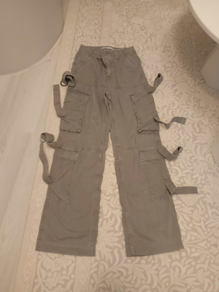 Gri keten kumaştan, kemerli ve bol kesim midi uzunlukta, çoklu kayış detaylı kadın pantolonudur. Rahat ve sokak stiline uygundur. Bel31 cm boy 101 cm. Çok güzel hafif taşlamış gibi bir kumaşı var. yaz kış giyilir. 32 beden. xxs