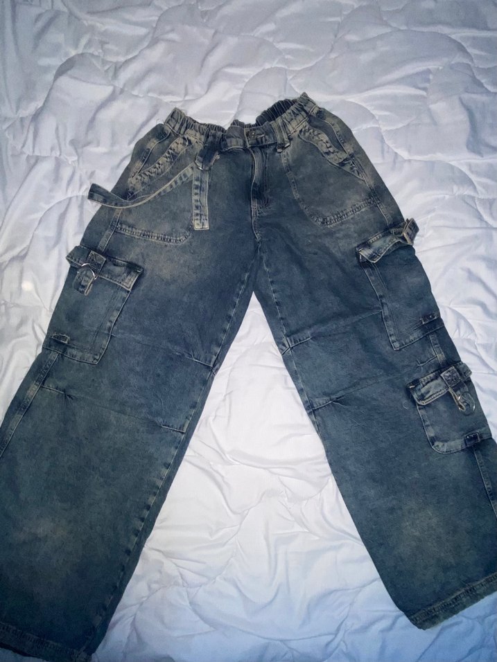 Kemer detaylı, bol kesim gri denim kot pantolon, çoklu ceplerle günlük sokak stili için uygundur. ✨