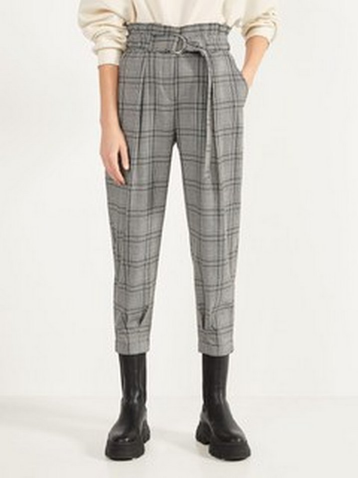 Kemerli bel ve ince kare desenli, salaş kesim gri kumaş pantolon, rahat ve günlük sokak stili için uygundur.