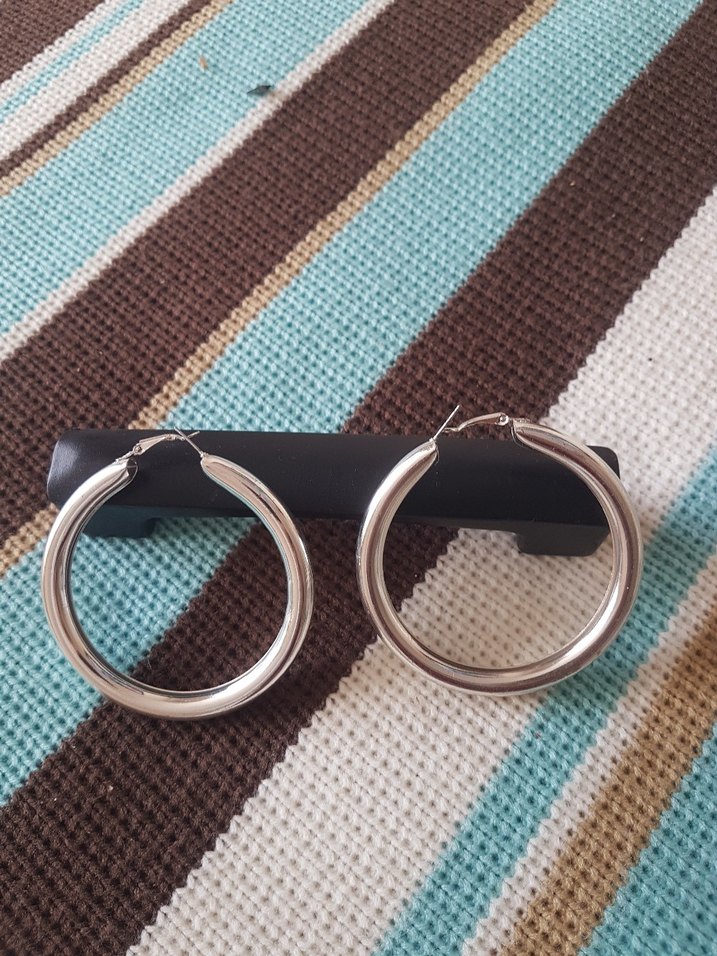 Bej ve gri tonlarında, kemerli kilit sistemine sahip büyük, uzun halka küpeler. Minimalist tasarımıyla günlük kullanıma uygundur.
