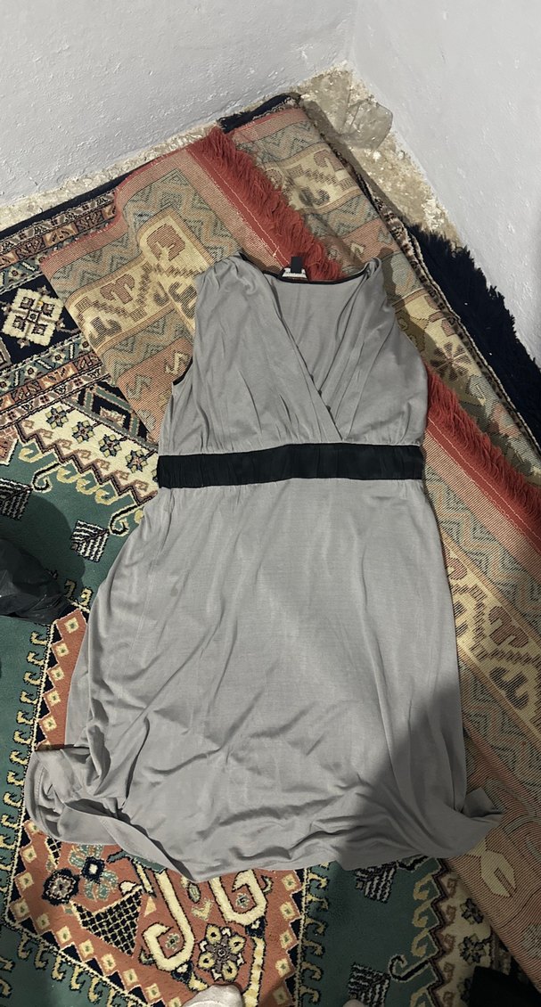 Kemer detaylı, V yaka, kolsuz gri hamile elbisesi. Düz ve ince sentetik kumaştan, günlük sokak stili için uygundur.