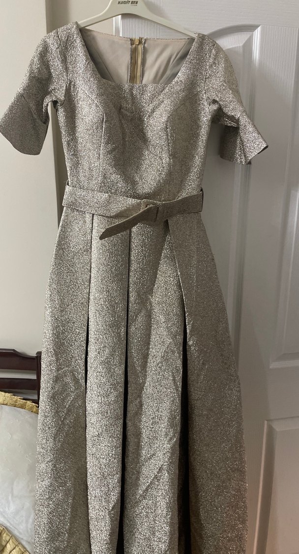 Gri renkli, kemerli ve kısa kollu uzun abiye elbise. Modern klasik tarzda, vintage esintili, ofis için uygun ve regular fit kesimlidir.