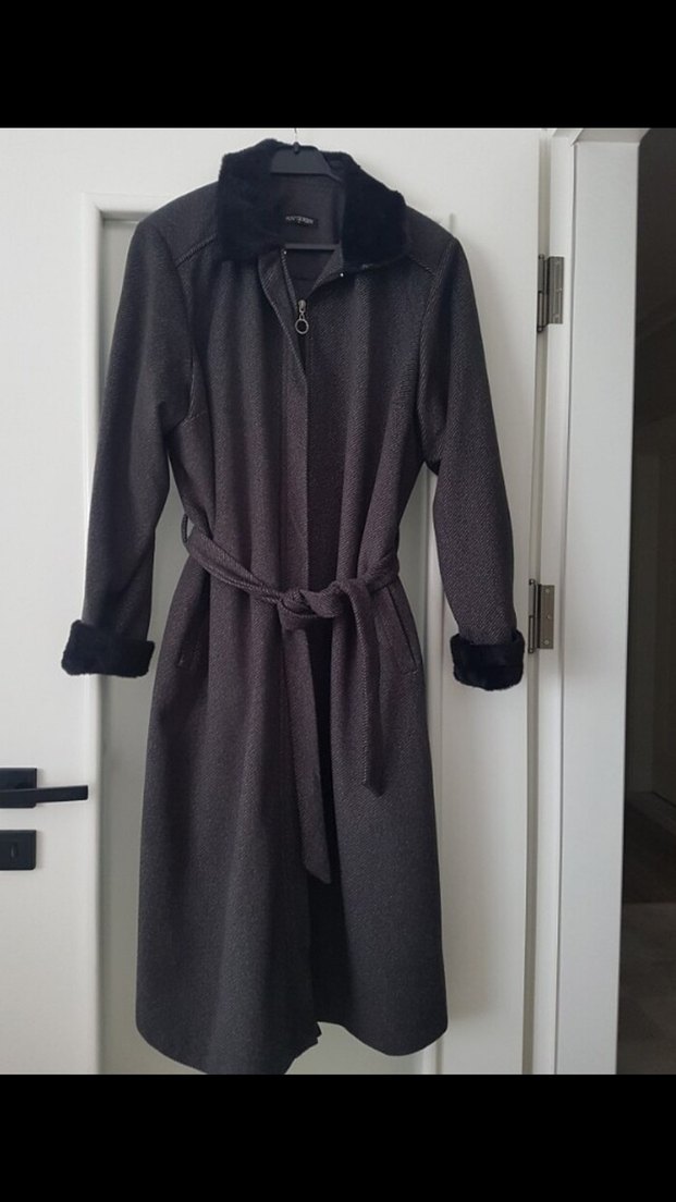 Gri renkli, uzun kesim, kemerli, bol kesim kadın kaban. Yaka ve manşetlerde sıcak tutan fleece detayları bulunur, ofis kullanımına uygundur.