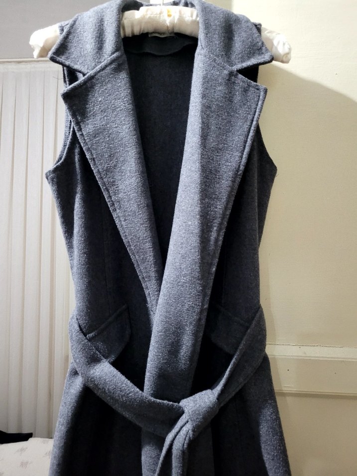 Kemerli kruvaze yaka detaylı, uzun boy gri yün yelek. 36-38 beden için uygundur.