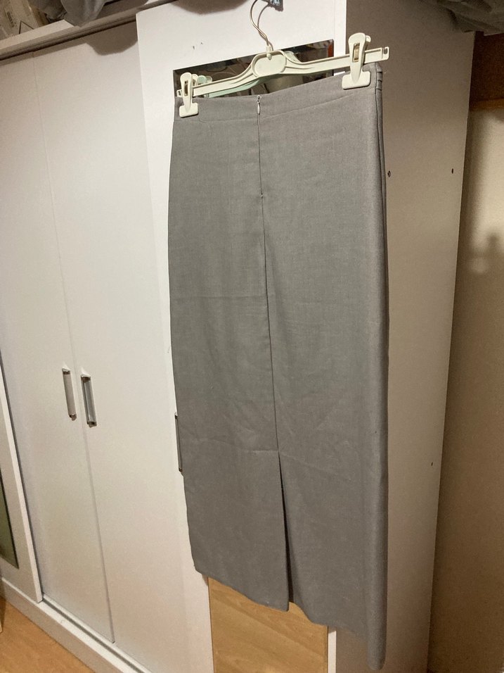 Gri renkte, keten kumaştan yapılmış, kemerli ve düz desenli uzun kadın eteği. İş ve ofis ortamına uygun, normcore tarzında.