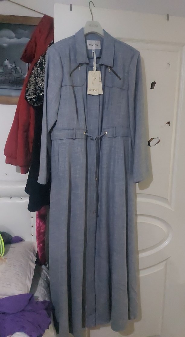 Gri Kemerli Uzun Keten Kadın Kaban Sıfırdır