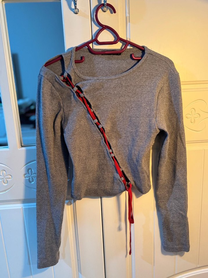 Fitted kesim, uzun kollu, kemerli ve farklı halter yaka detayı bulunan gri triko kazak. Günlük kullanıma uygun şık bir sokak stili parçası.