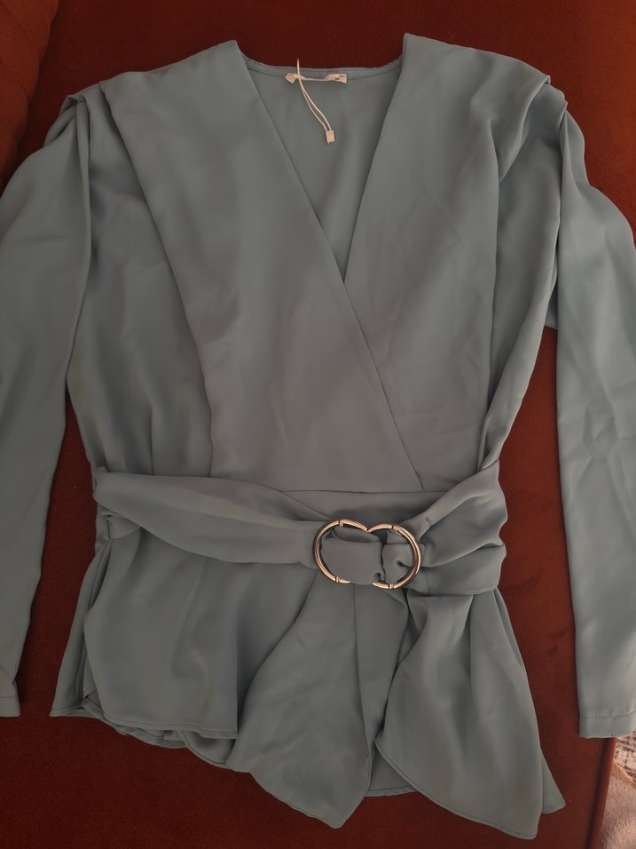 Gri renkli, V yaka ve uzun kollu kadın bluz, kemerli ve bol kesimdir. İpek gibi kumaştan üretilmiş, çağdaş ve Paris tarzı casual görünüm için uygundur, ofis kullanımı için idealdir.