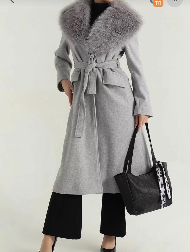Gri renkte, kemerli ve geniş kürklü yakaya sahip, yumuşak ve sıcak kumaştan uzun kollu kaban. Yan ceplerle tamamlanmıştır.