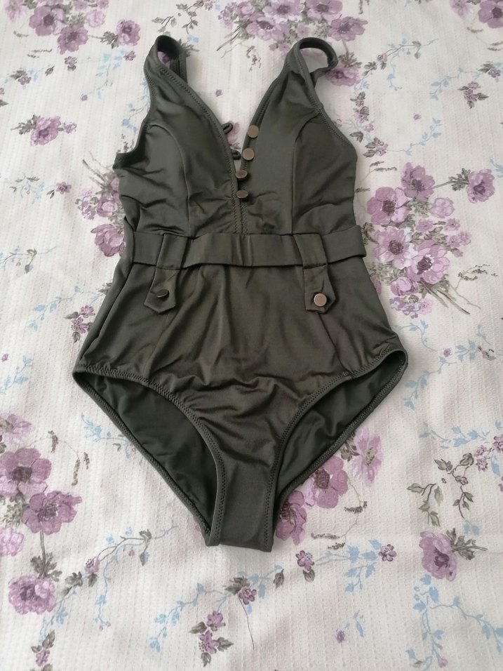 Gri renk, kemerli ve askılı kol detaylı, vintage gotik tarzda, vücuda oturan mayo. Düz ve şık tasarım, plaj için uygun.