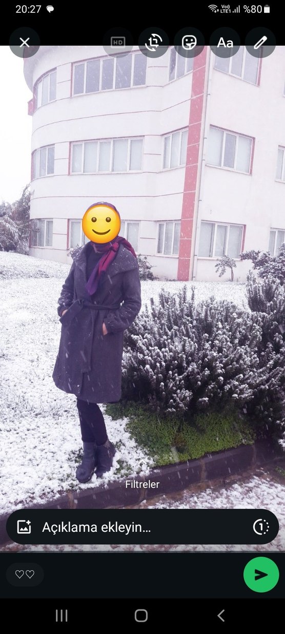 Gri renkte, kemerli ve yüksek yakalı, uzun kollu, orta boy kadın kaban. ️ 36- 38 bedene uygun