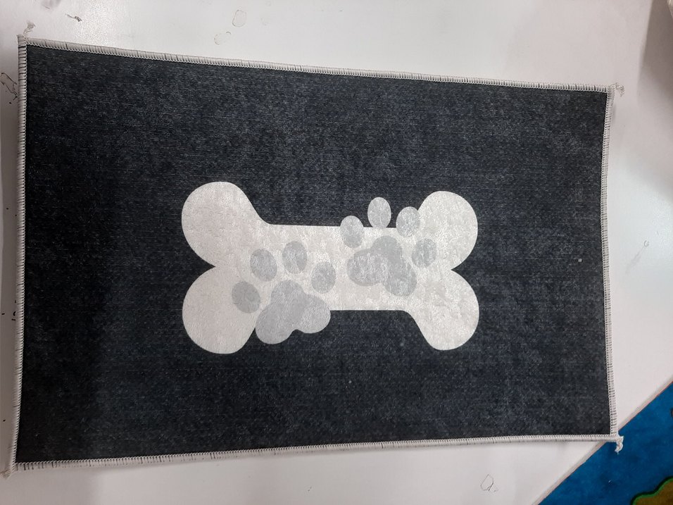 Gri renkte, üzerinde büyük kemik ve pati izi desenleri bulunan köpek paspası. Evcil hayvanlar için rahat ve temiz bir alan sağlar.