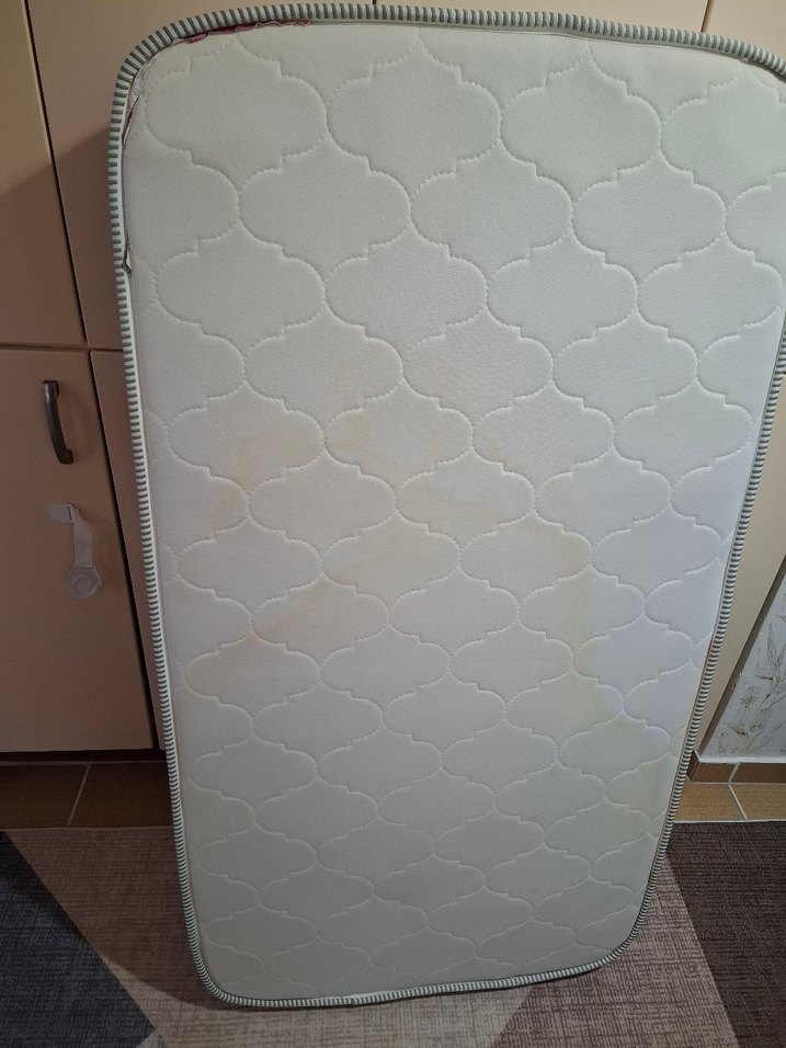 Gri kenarlı beyaz bebek yatağı, kapitone desenli ve yüzeyinde hafif lekeler bulunuyor. ️bir yüzündede sürtünmeden kaynaklı pamuklanma mevcut. bu yüzden fiyatı uygun tuttum. ankara gel al fiyatıdır