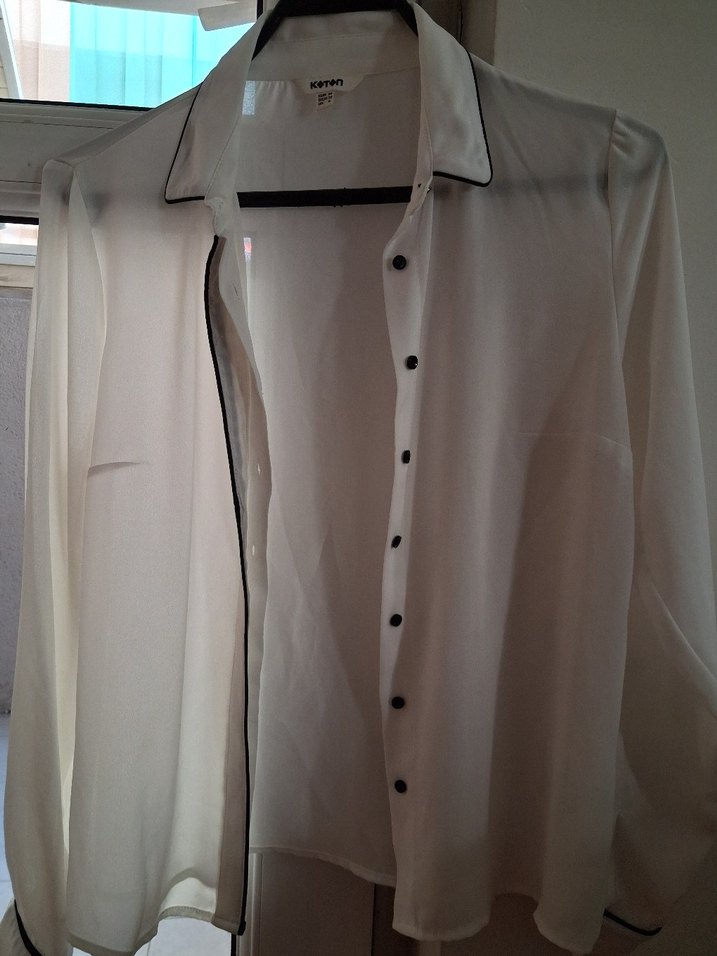 Gri kenarlı beyaz düğmeli kadın gömlek, yakalı ve uzun kollu. İpek gibi kumaştan, bol kesim, ofis ve sokak stiline uygun.
