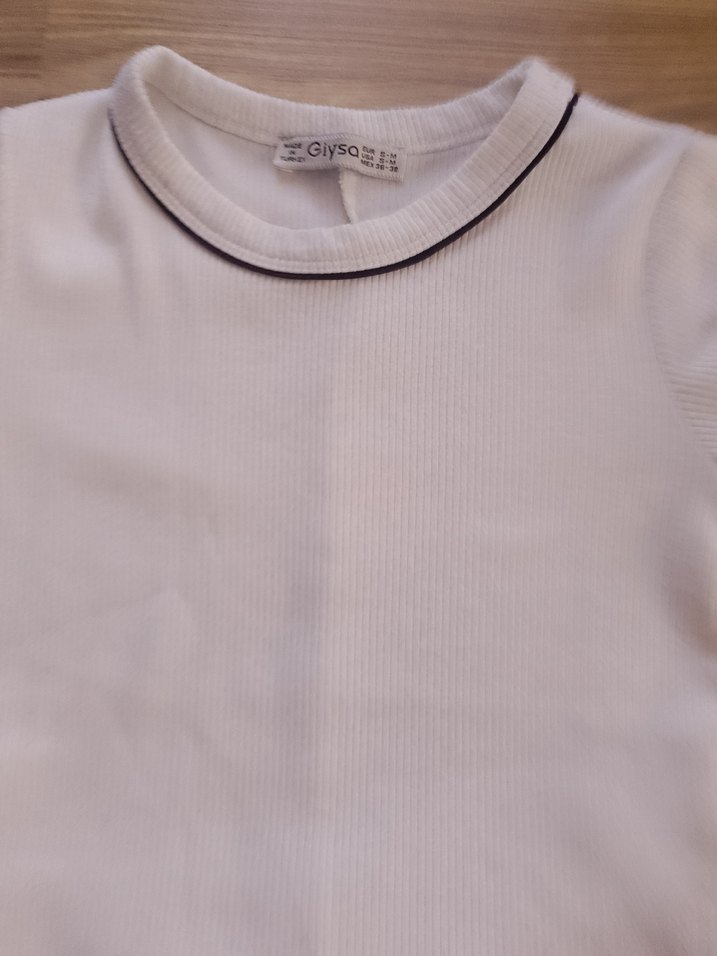 Yaka ve kol uçlarında gri detaylı, yumuşak kumaştan beyaz krop
