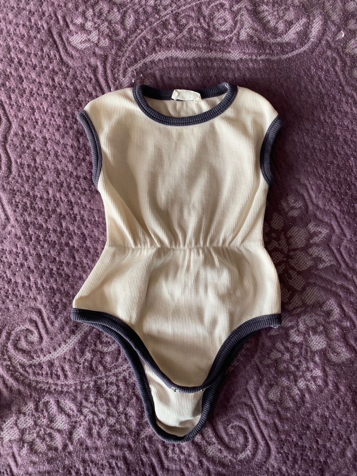 Gri kenarlıklı beyaz kolsuz bebek body, yuvarlak yaka ve yumuşak kumaş ile sade şıklık sunar. 1-3 ay