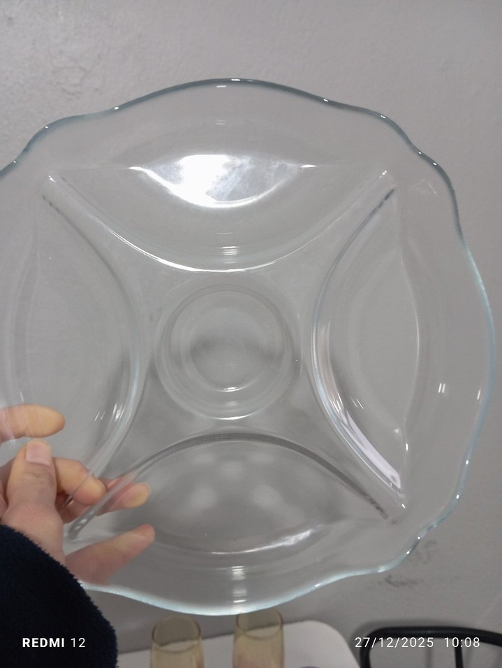 Gri kenarlı, şeffaf camdan yapılmış, desen içermeyen çağdaş tarzda bir tabak.