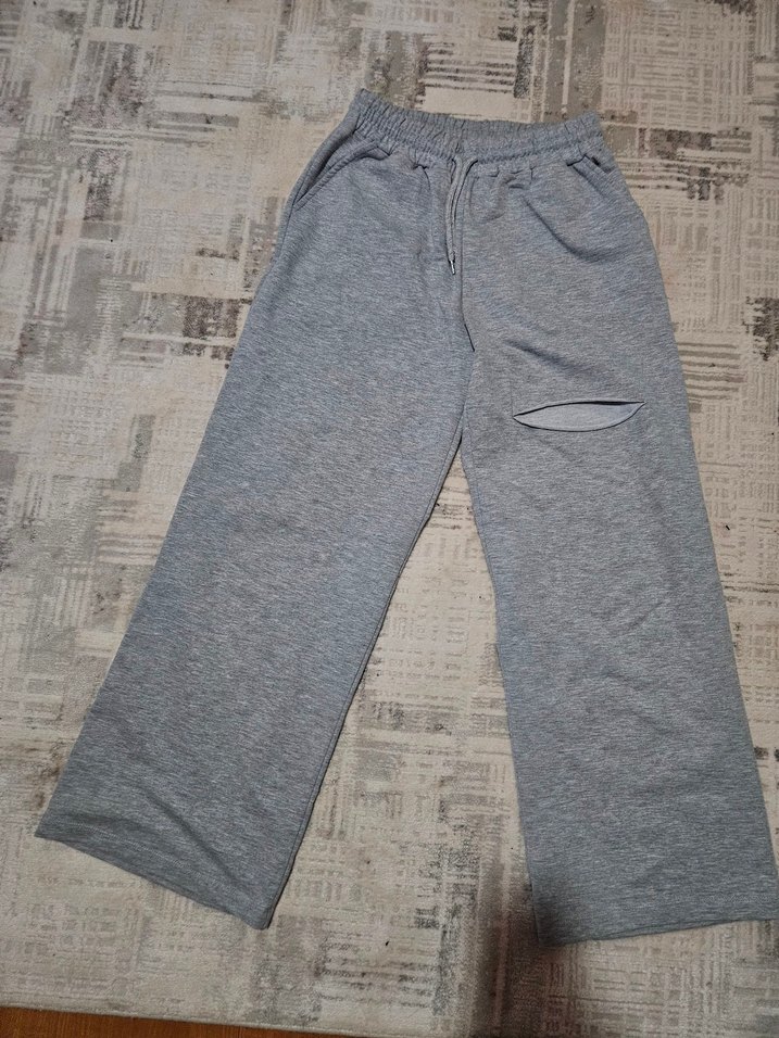 Gri renkli, pamuklu kumaştan yapılmış, kesik detaylı, bol kesim midi uzunluğunda kadın eşofman altı. Günlük rahatlık ve sokak stili için uygundur.