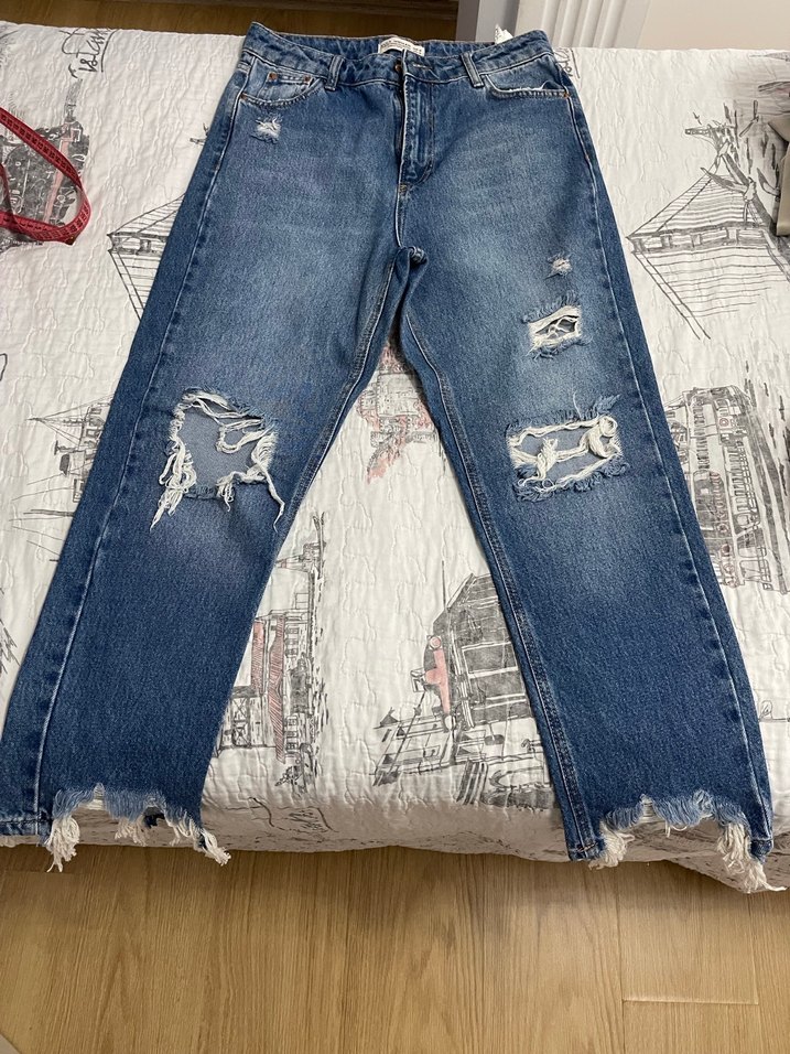 Bol kesim, midi boy gri denim kadın jean. Yırtık detaylara ve tokalı tasarıma sahip, günlük kullanıma uygun sokak stili jean.