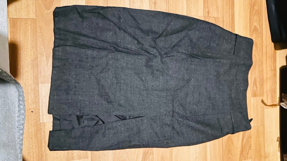 Yumuşak keten kumaştan, gri renkte kadın önden yırtmaçlı kalem etek Normal kesim, uzun boy ve sade, minimal tarzda, yırtmaç detayı içerir.