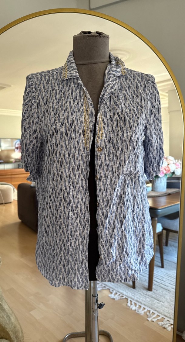 Gri keten kumaştan, yakalı ve düğmeli, kısa kollu bol kesim bohem kadın gömleği. Günlük kullanıma uygun.