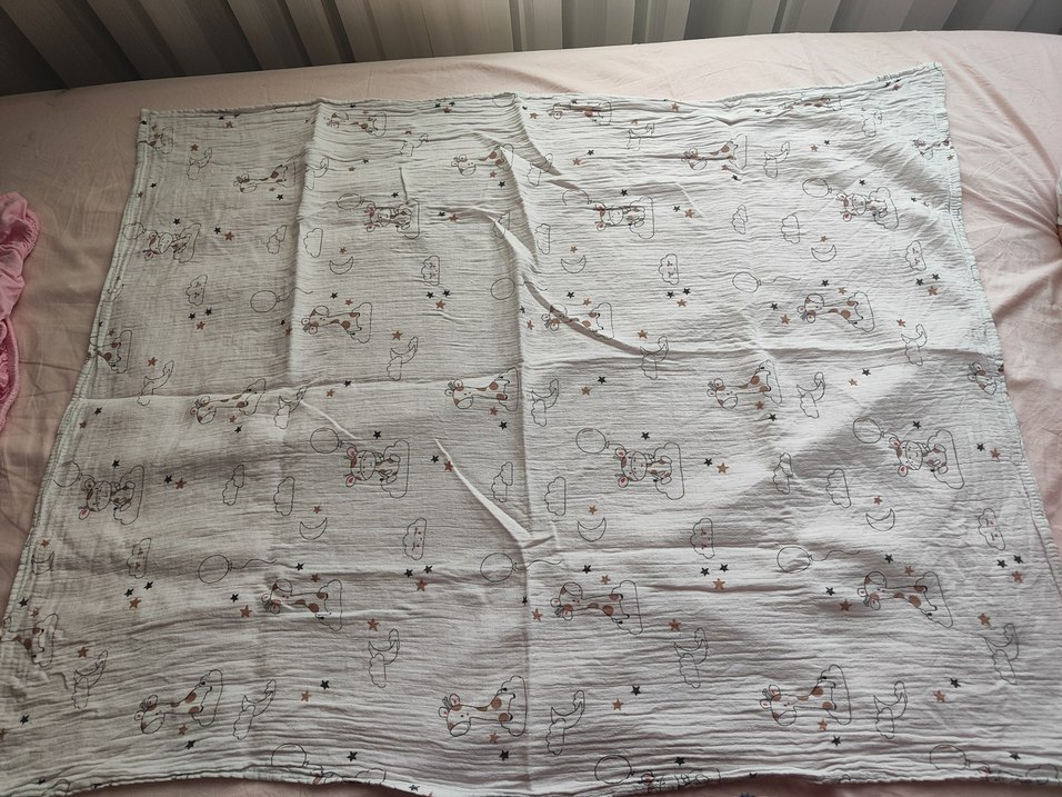 Yumuşak keten kumaştan gri çocuk battaniyesi, yıldız ve bulut desenleriyle huzurlu bir uyku sağlar.