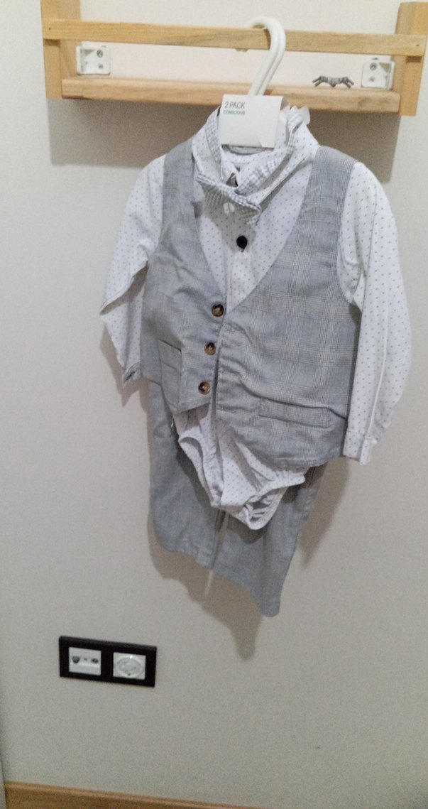 Düğmeli, keten dokulu gri yelek, küçük noktalı beyaz uzun kollu gömlek ve gri pantolonla tamamlanmıştır. Bohem tarz, kesik yakalı.