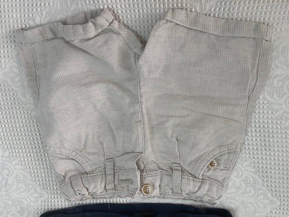 Gri keten kumaştan, düğmeli, bol kesim erkek çocuk pantolonu, sade ve temel sokak tarzı sunar. 12/18 ama 2 yaşta giyebilir