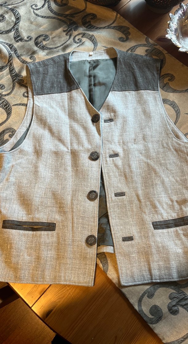 Düğmeli, keten kumaştan, gri renkte, notched lapel yakalı, normal kesim ve bohem tarzda erkek yelek. Günlük kullanıma uygundur. Ham keten orijinal