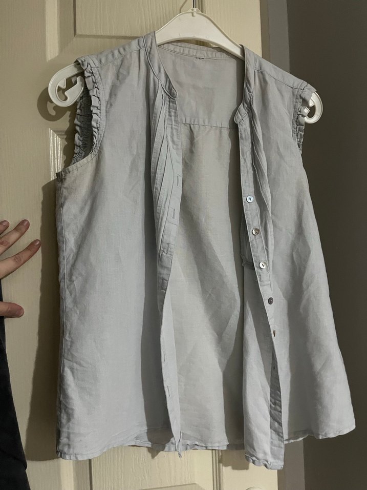 Gri keten kumaştan, düğmeli ve yakalı, kolsuz kadın bluzu. Bol kesimi ve bohem tarzıyla günlük kullanıma uygundur.