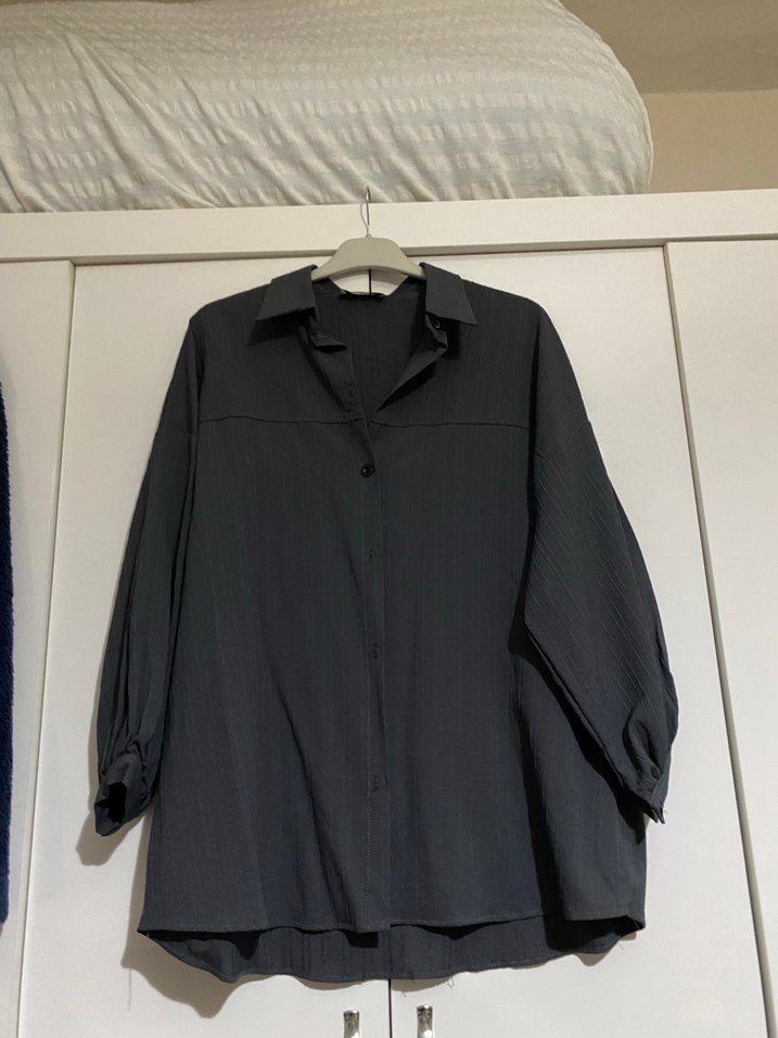 Gri Keten Düğmeli Kadın Gömlek