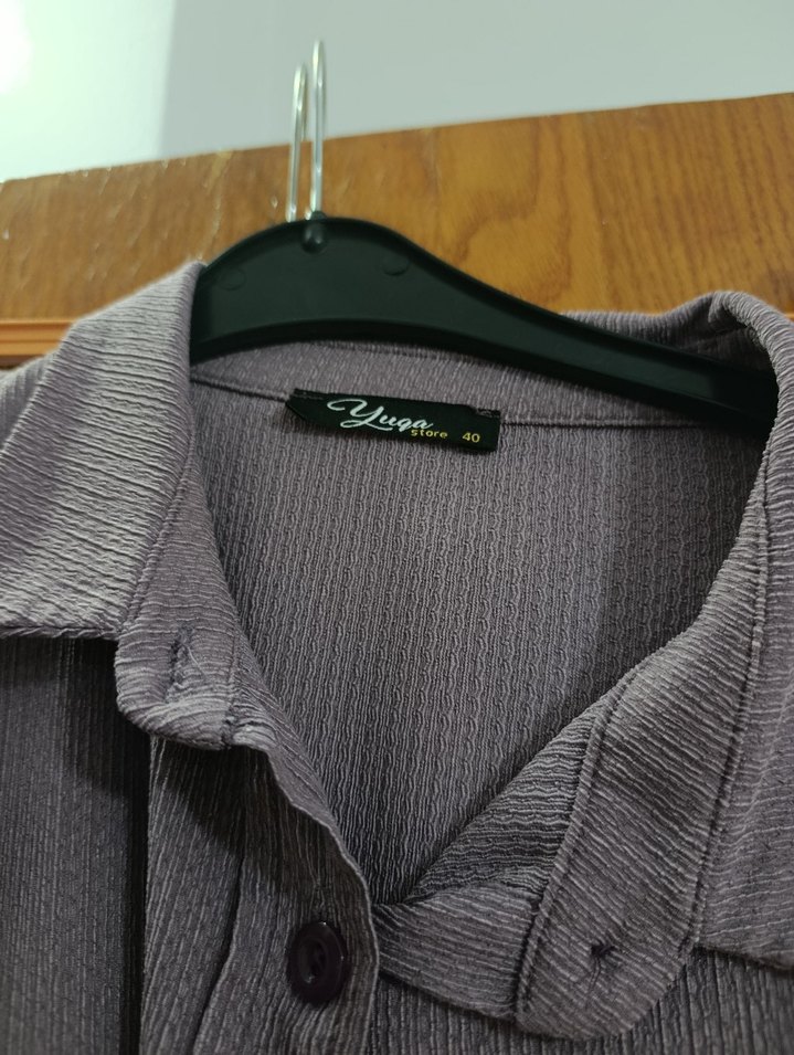 Geniş kesim, düğmeli ve keten kumaştan yapılmış, gri renkte, notched lapel yakalı ve uzun kollu kadın gömleği. Rahat ve gündelik kullanıma uygun.