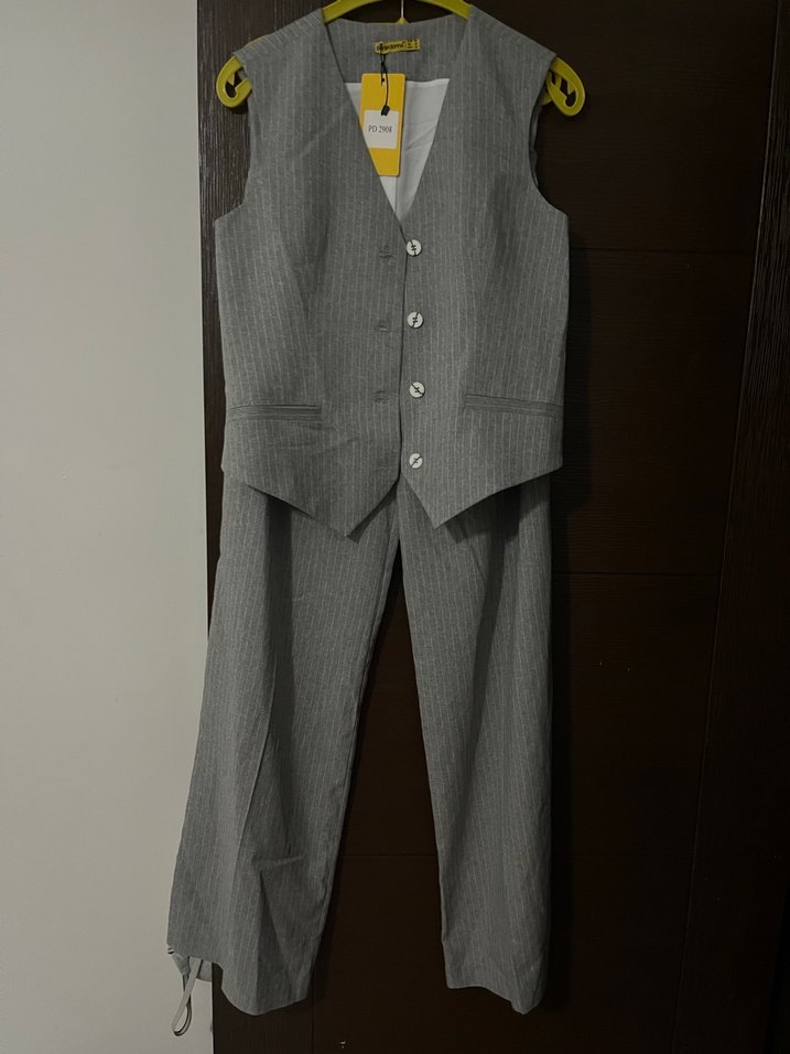 Gri keten kumaştan, düğmeli ve kolsuz, normal kesim midi uzunluğunda kadın takım elbisesi. Ofis kullanımı için uygundur.