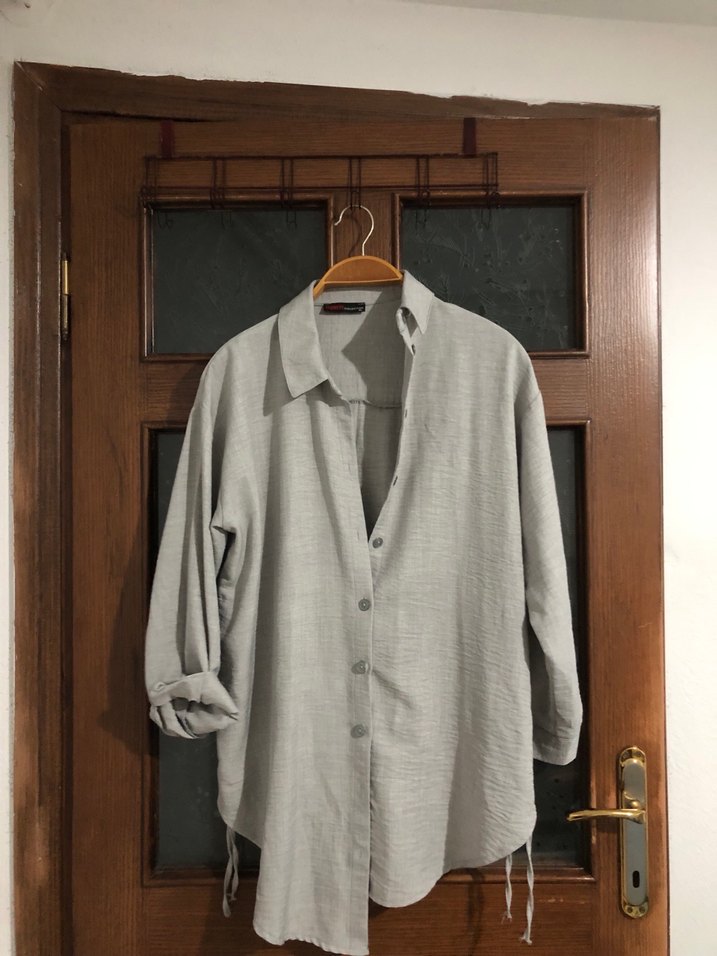 Gri keten kumaştan, düğmeli, uzun kollu ve notched yaka detaylı, bol kesim midi uzunluğunda kadın gömlek. Minimalist ve normcore tarzda, günlük kullanıma uygun.