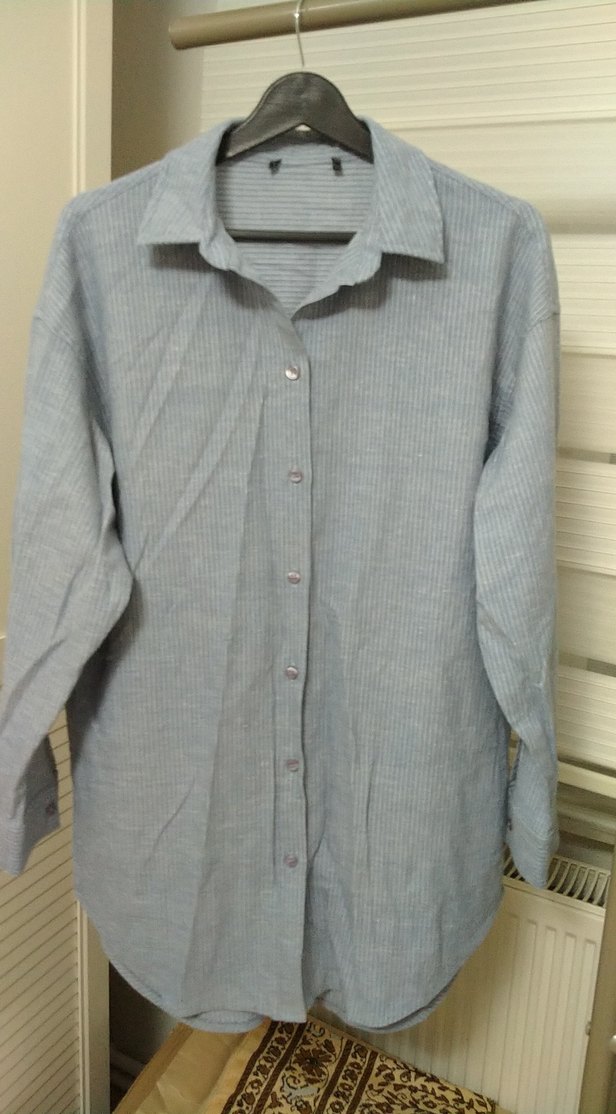 Gri keten kumaştan, düğmeli ön kısmı, uzun kolları ve kesik yaka detayına sahip kadın gömleği. Rahat kesimi ve normal boyuyla günlük kullanıma uygun.