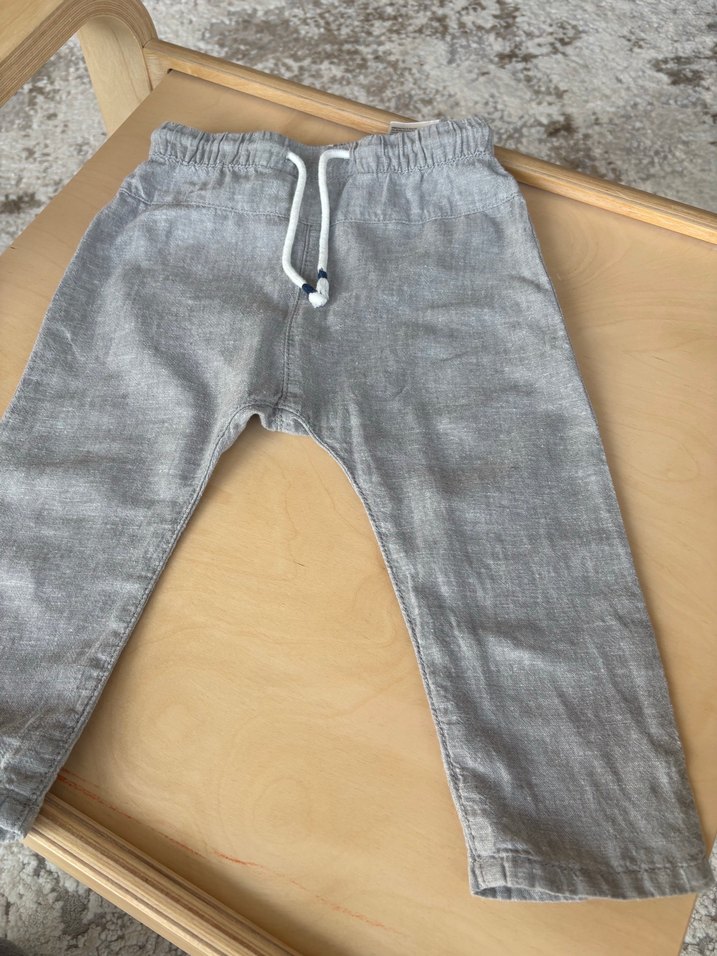 Gri keten kumaştan yapılan, bol kesim ve bağcıklı lastik bel detayına sahip erkek çocuk pantolonu.