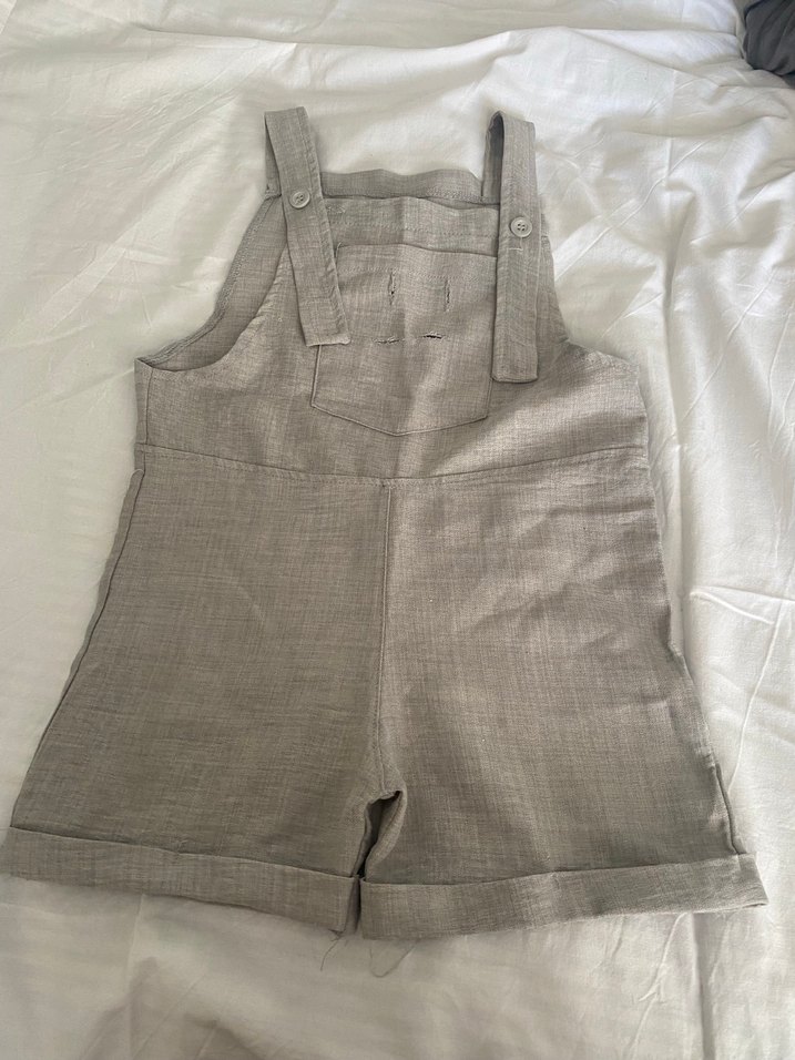 Gri keten kumaştan, kolsuz, erkek çocuklar için rahat kesim ve bohem tarzda salopet. Effortless chic görünüm sağlar.