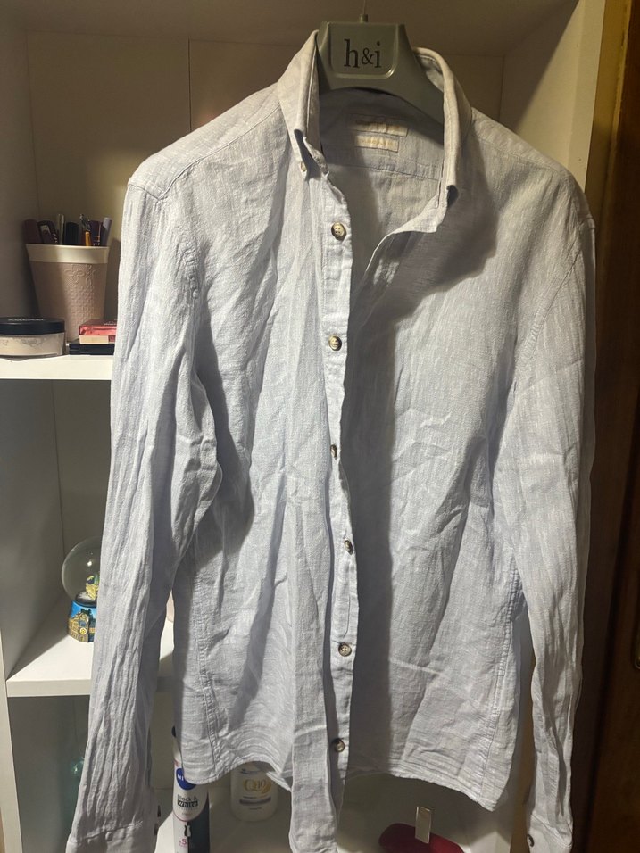 Gri keten erkek gömlek, yakalı ve düğmeli. Bol kesim, uzun kollu ve desensiz, günlük rahat sokak stili için uygun. Normal midi boyda.