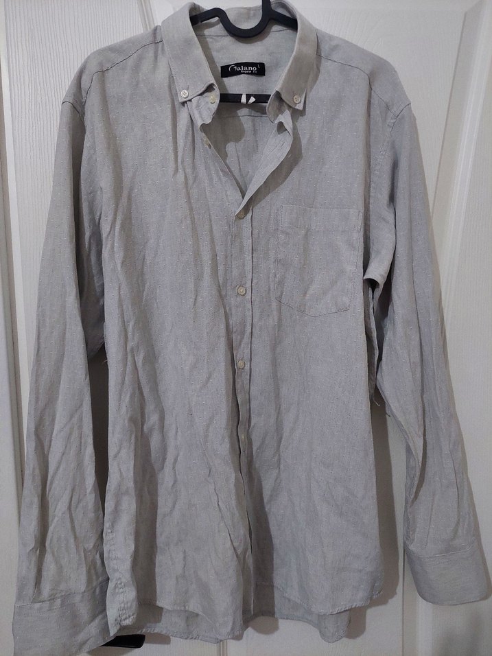 Gri keten kumaştan yapılmış, düğmeli ve yakalı erkek gömleği. Uzun kollu ve rahat kesim, günlük veya ofis kullanımı için uygundur.