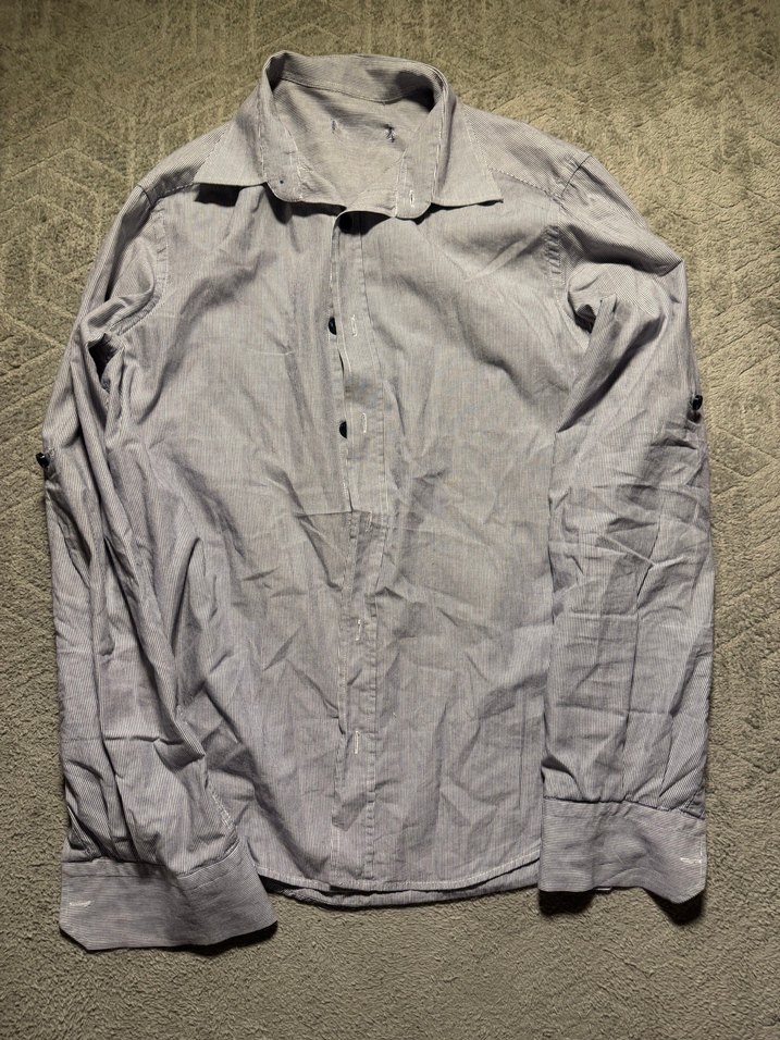 Gri renkte keten kumaştan, uzun kollu ve düğmeli, salaş kesim erkek gömleği. Yakalı ve günlük rahat sokak stili için uygundur.