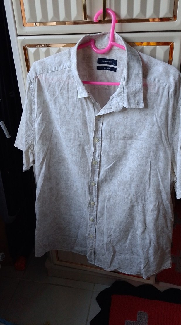 Keten kumaştan yapılmış, kısa kollu, düğmeli ve yakalı gri erkek gömleği. Rahat kesimi ve normal boyuyla günlük sokak stiline uygundur.