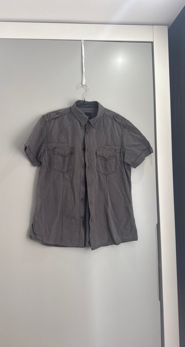 Keten kumaştan, kısa kollu, düğmeli ve yakalı gri erkek gömleği. Salaş kesimiyle günlük ve sokak stiline uygundur.